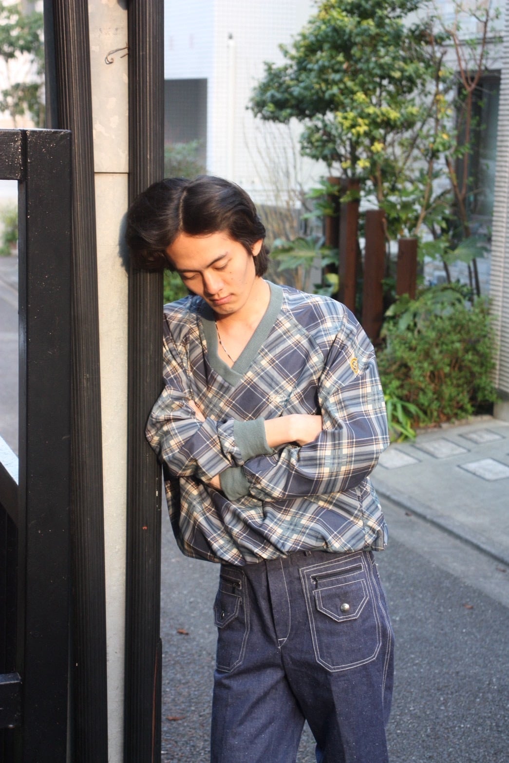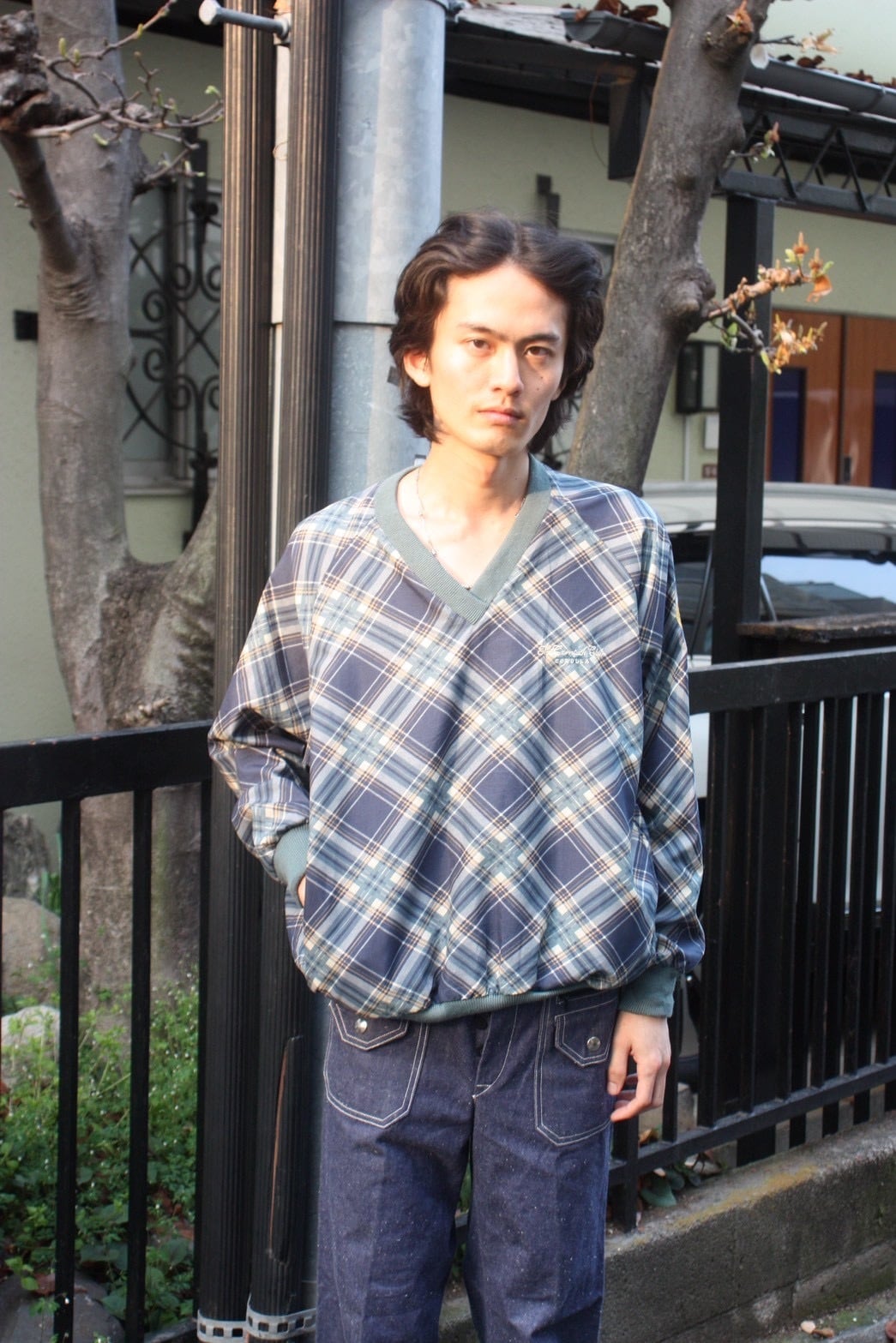 Plaid Nylon V-neck Pullover Shirt