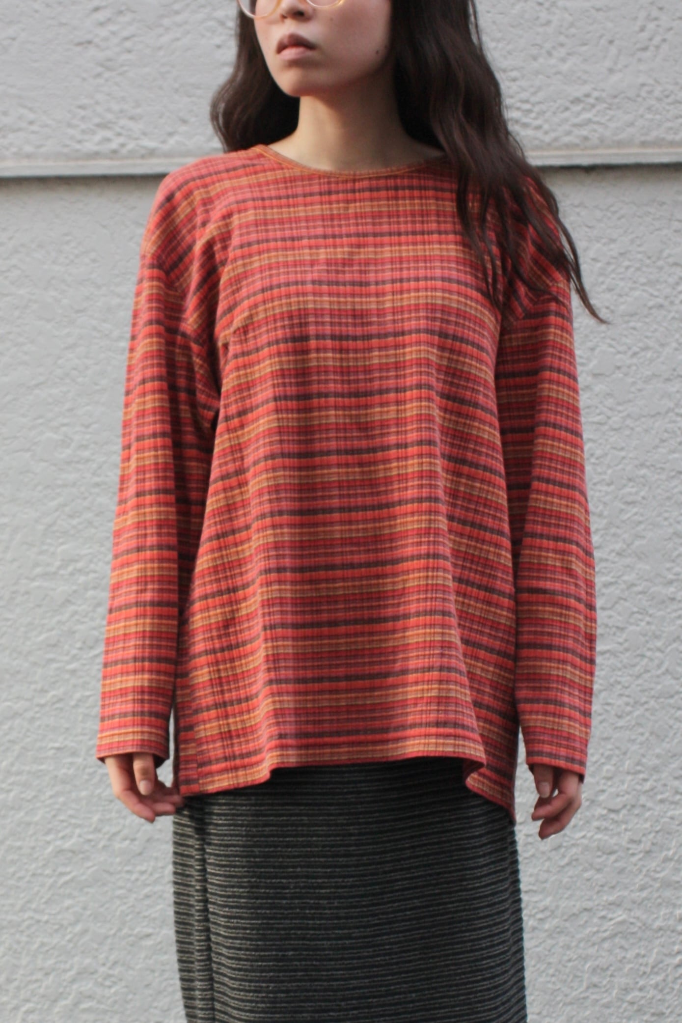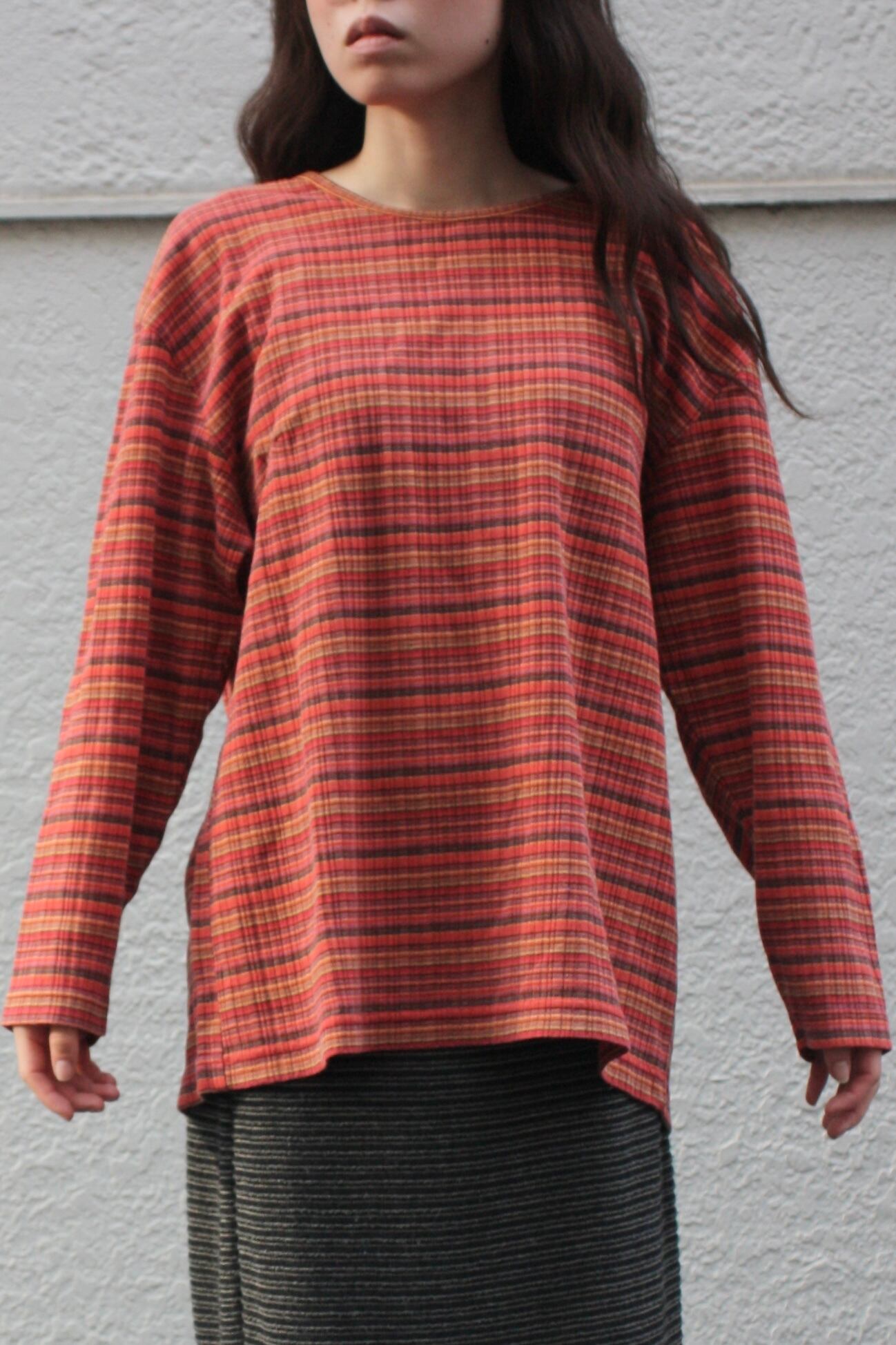 幾重にも重なる、枯れた赤が目を惹くボーダーカットソー。