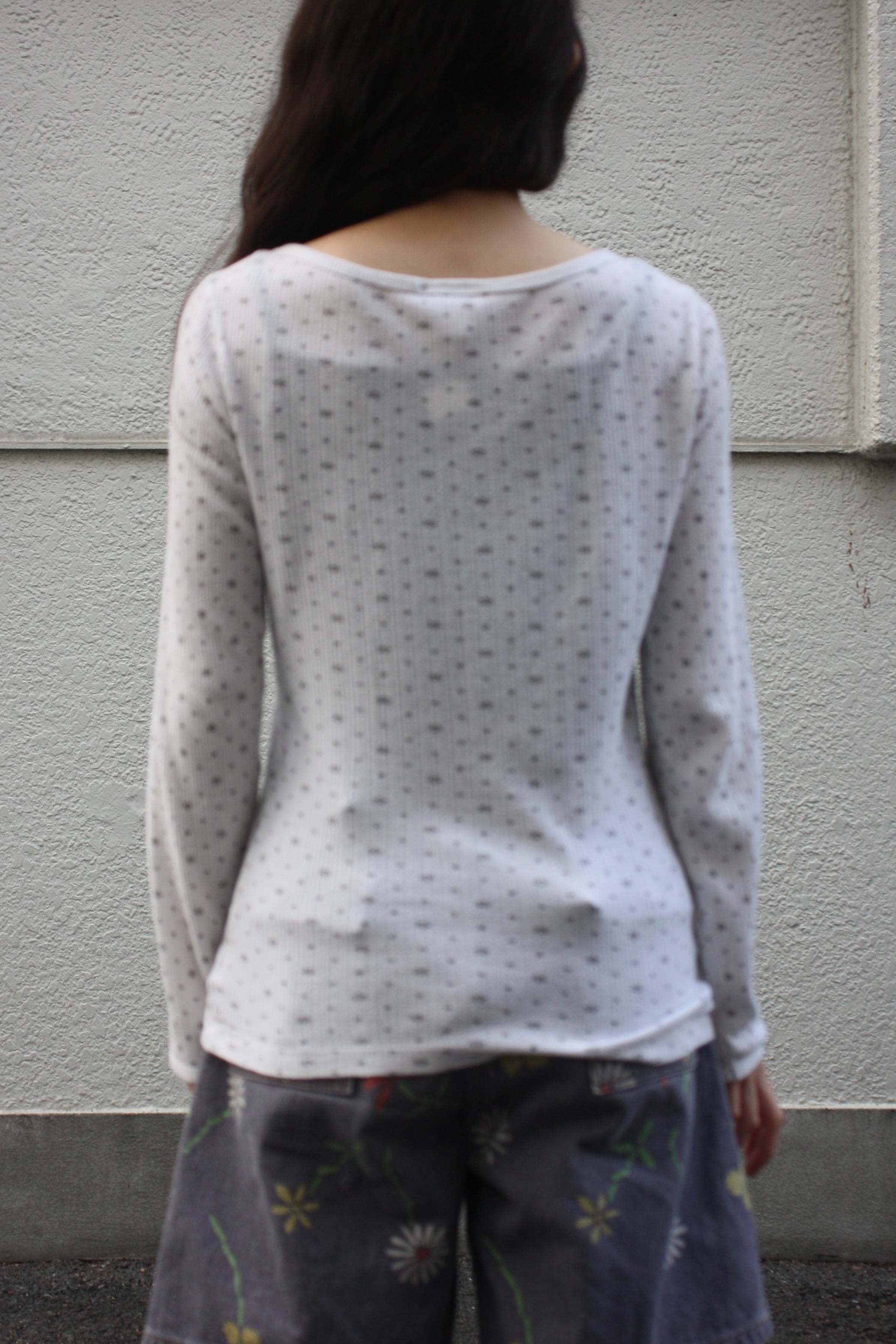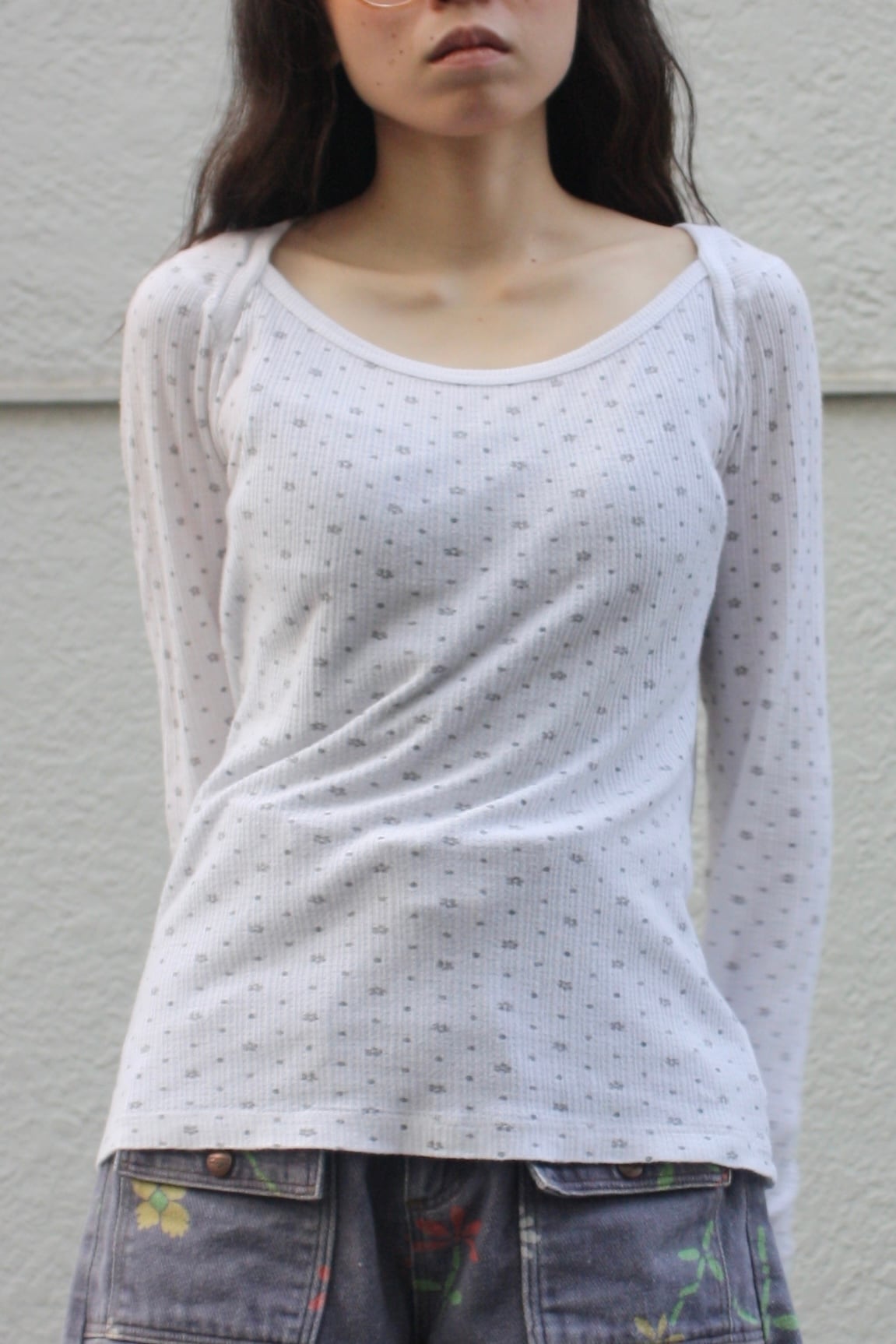 花柄という饒舌なモチーフを、サーマルの無骨な質感が優しく引き立て、最高に気だるく、知的な余白へと変貌させています。