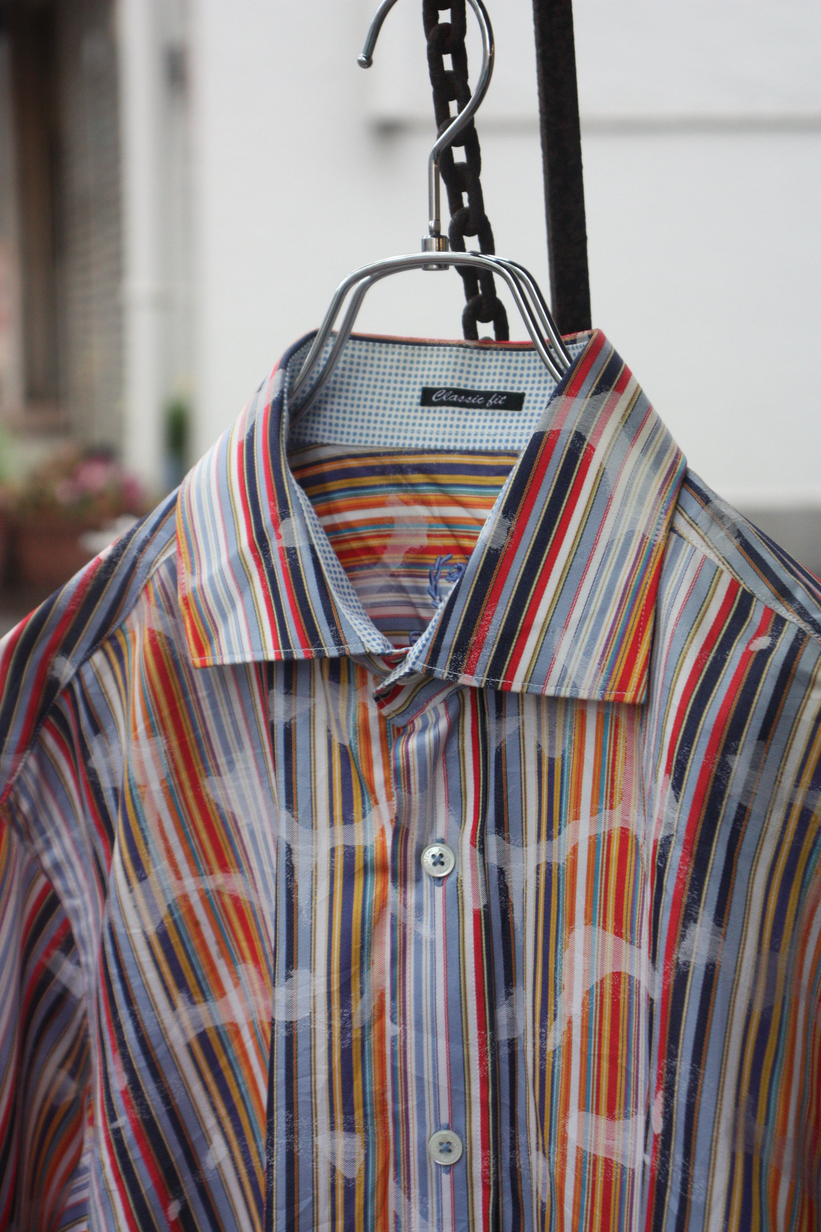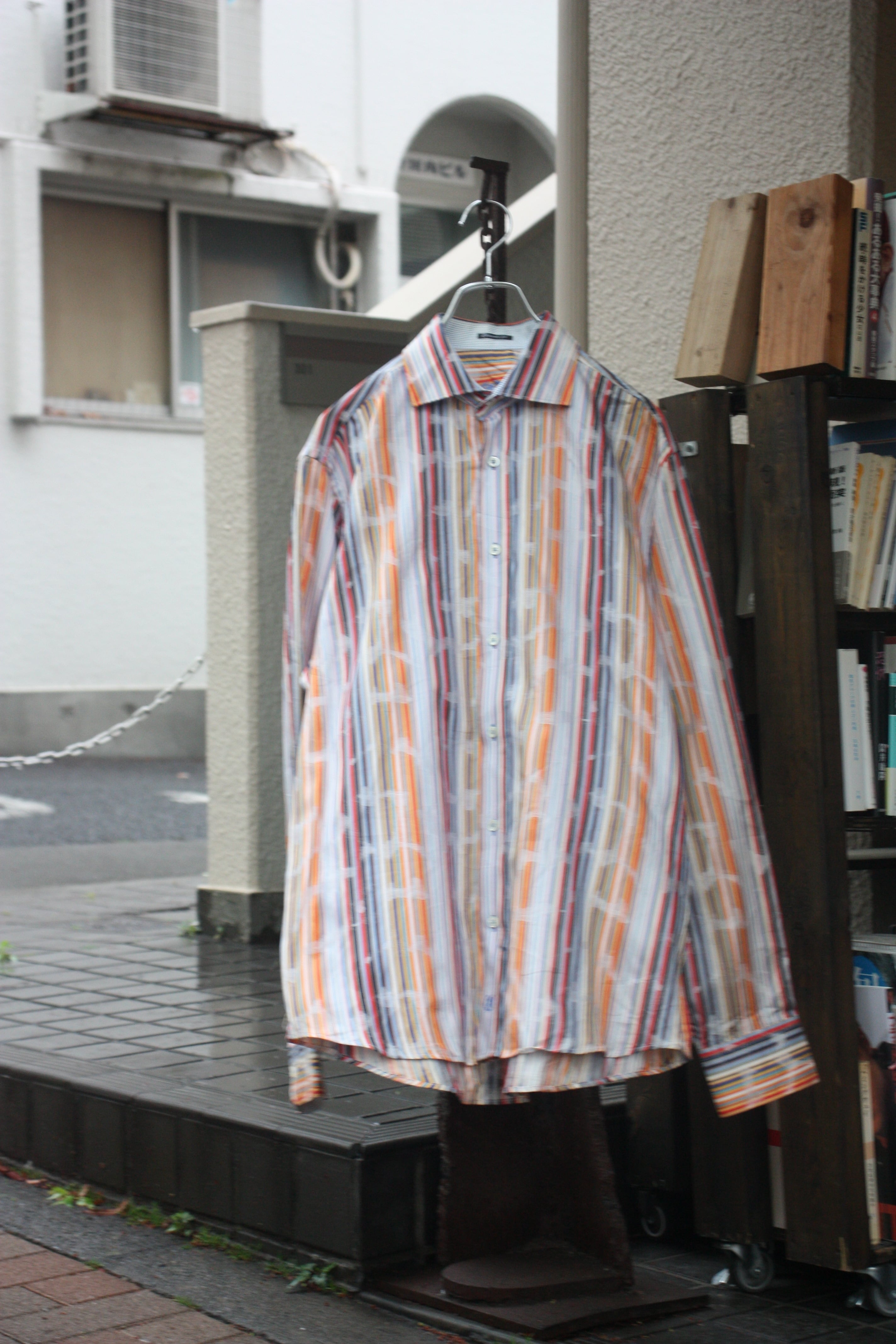 マルチストライプの規則性を切り裂くように施された、箔プリントのような特殊なテクスチャー。自然と雰囲気が出ますね。
