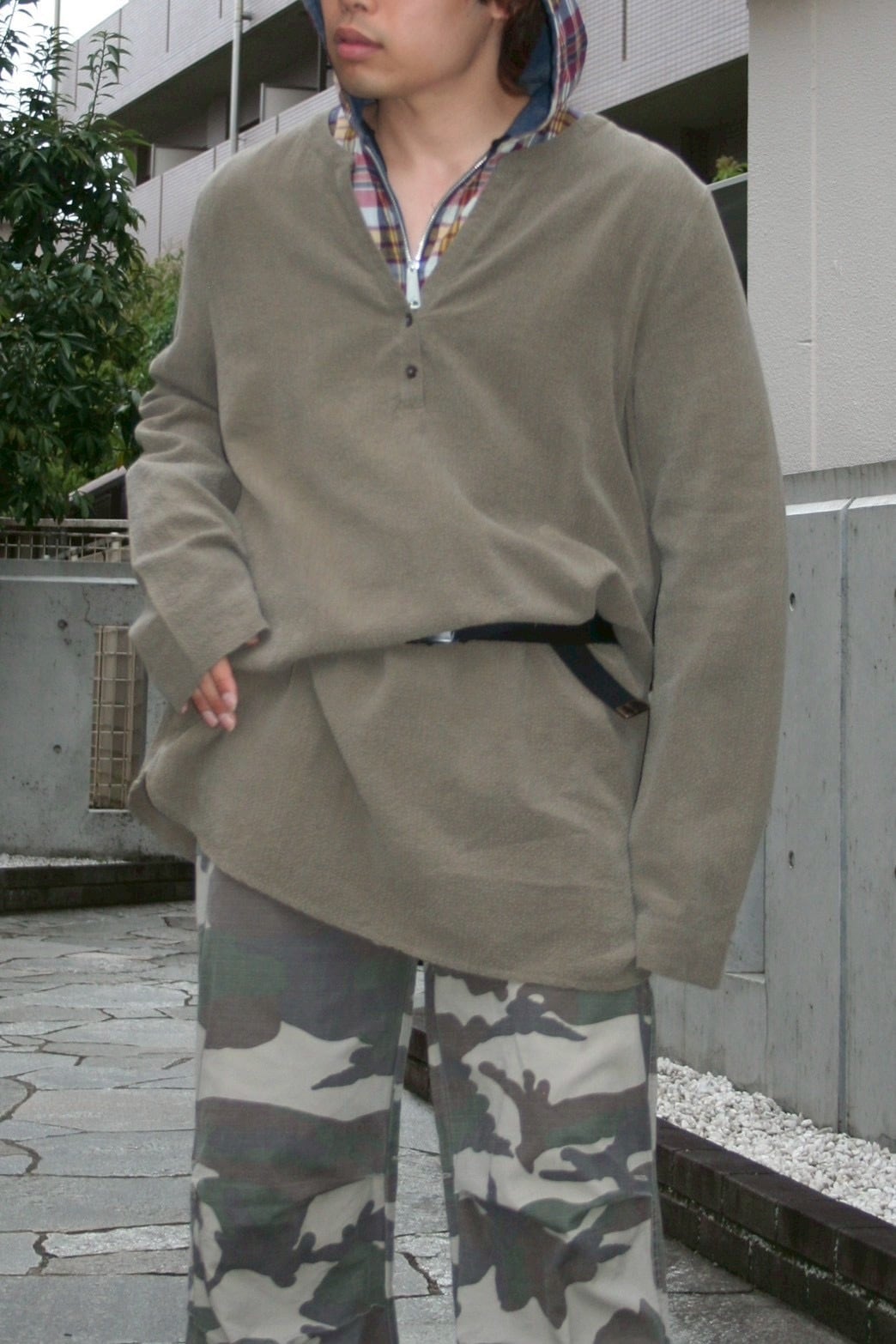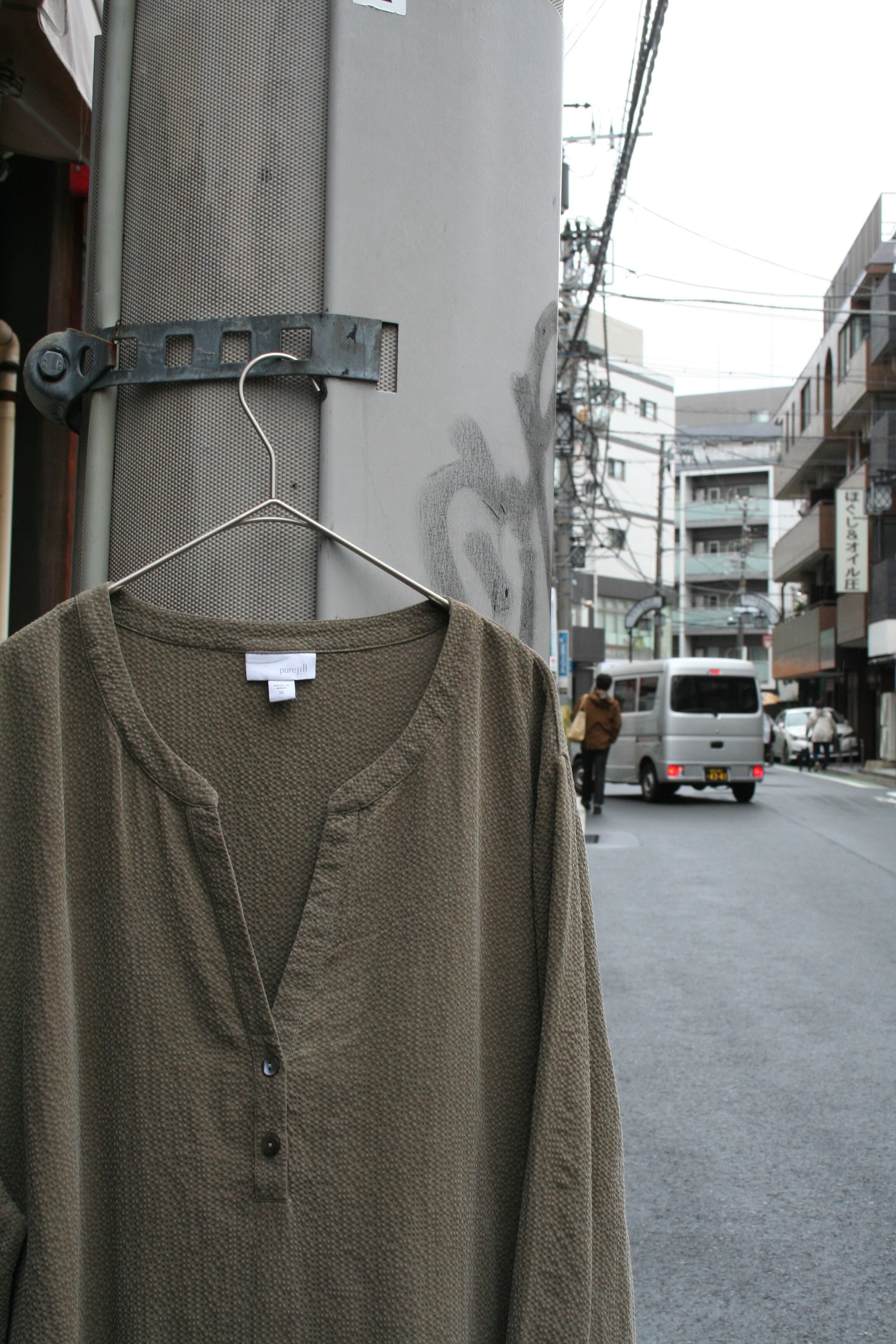 カッターシャツとしての端正な襟元を持ちながら、ボタンを排したプルオーバーという、身体をすっぽりと包み込む無防備な形式です。