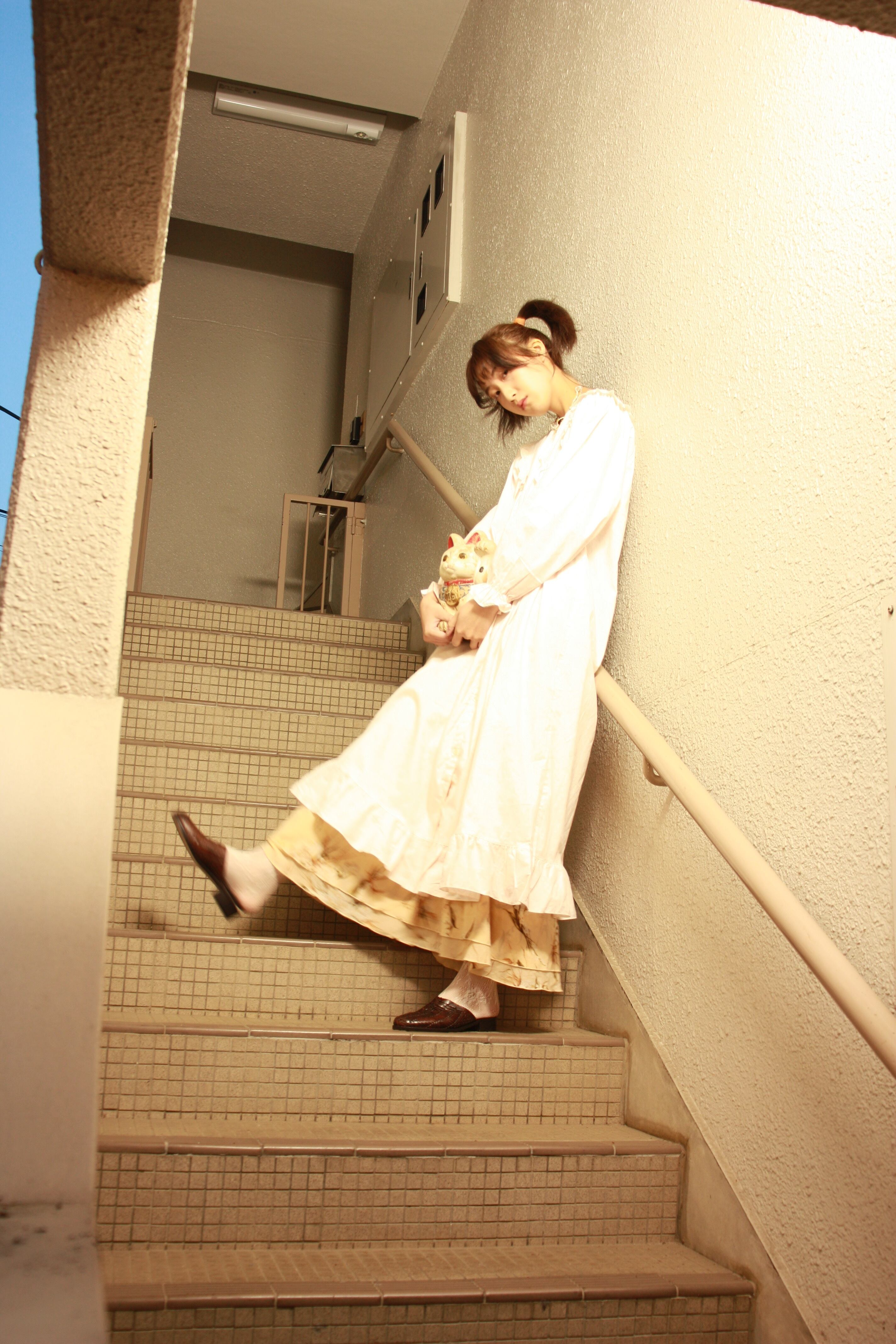 膝下を横切る繊細なレースの境界線。垂直に流れるドレープに「静かな句読点」を打ちます。いつまでも寄り添ってくれる一着です。
