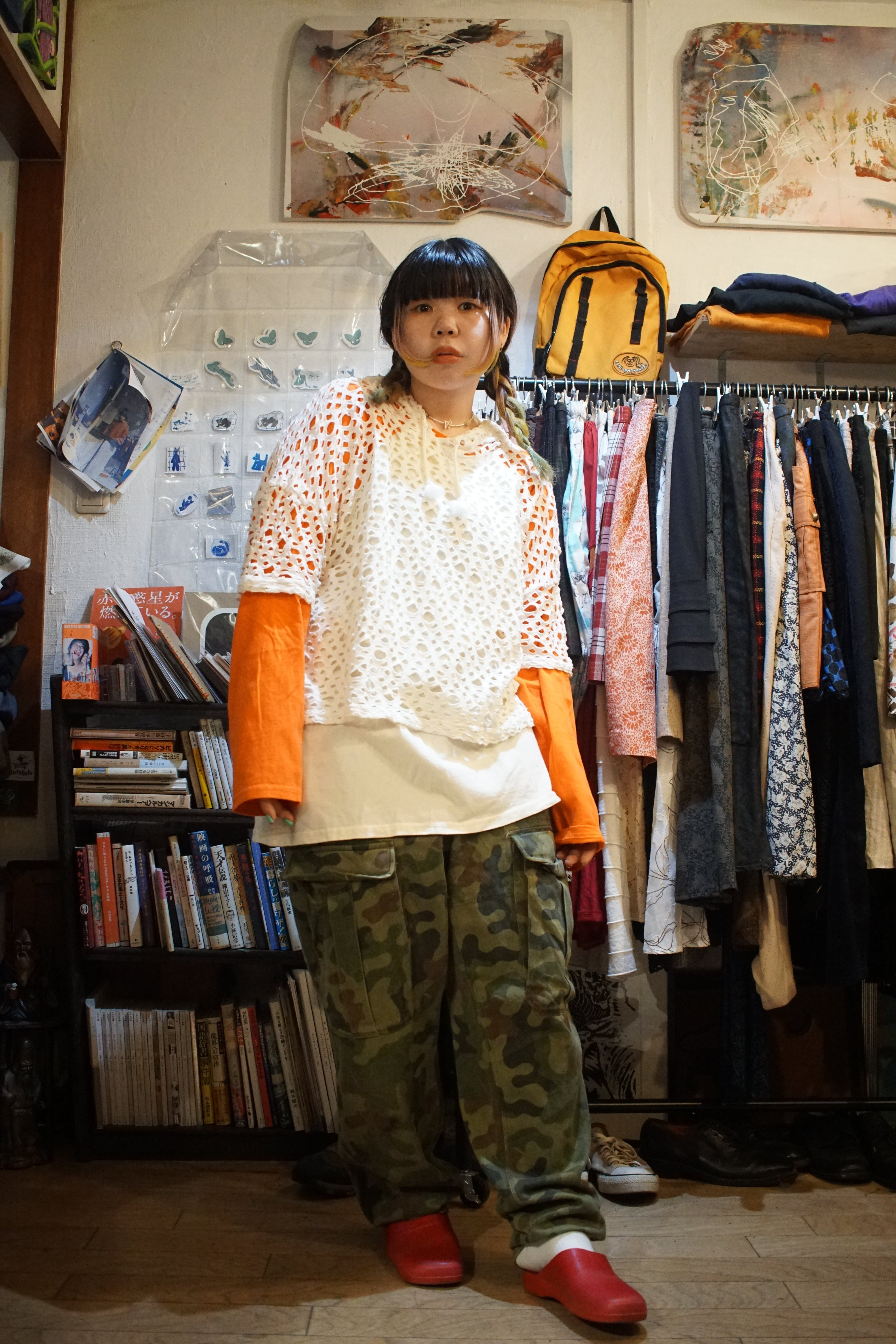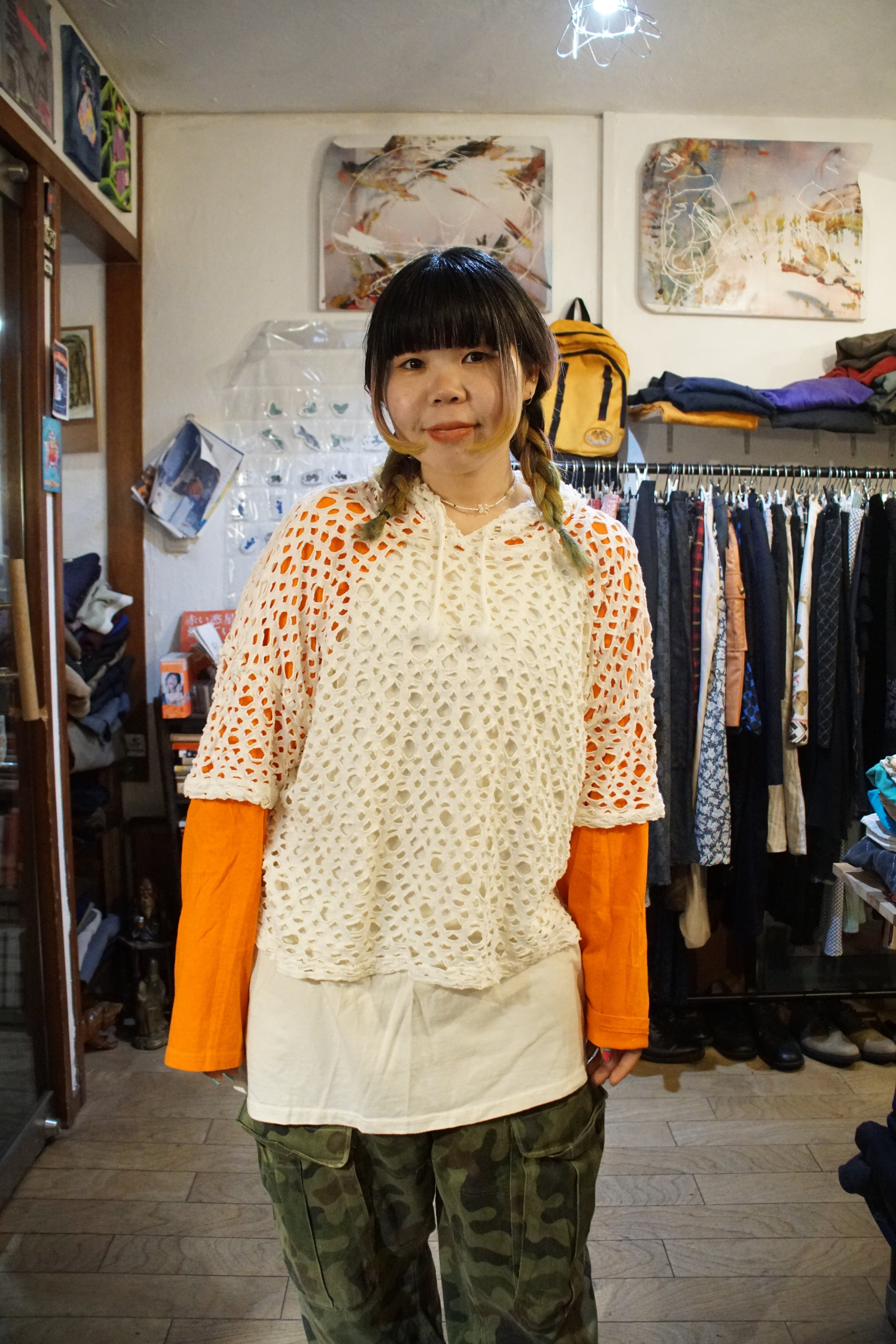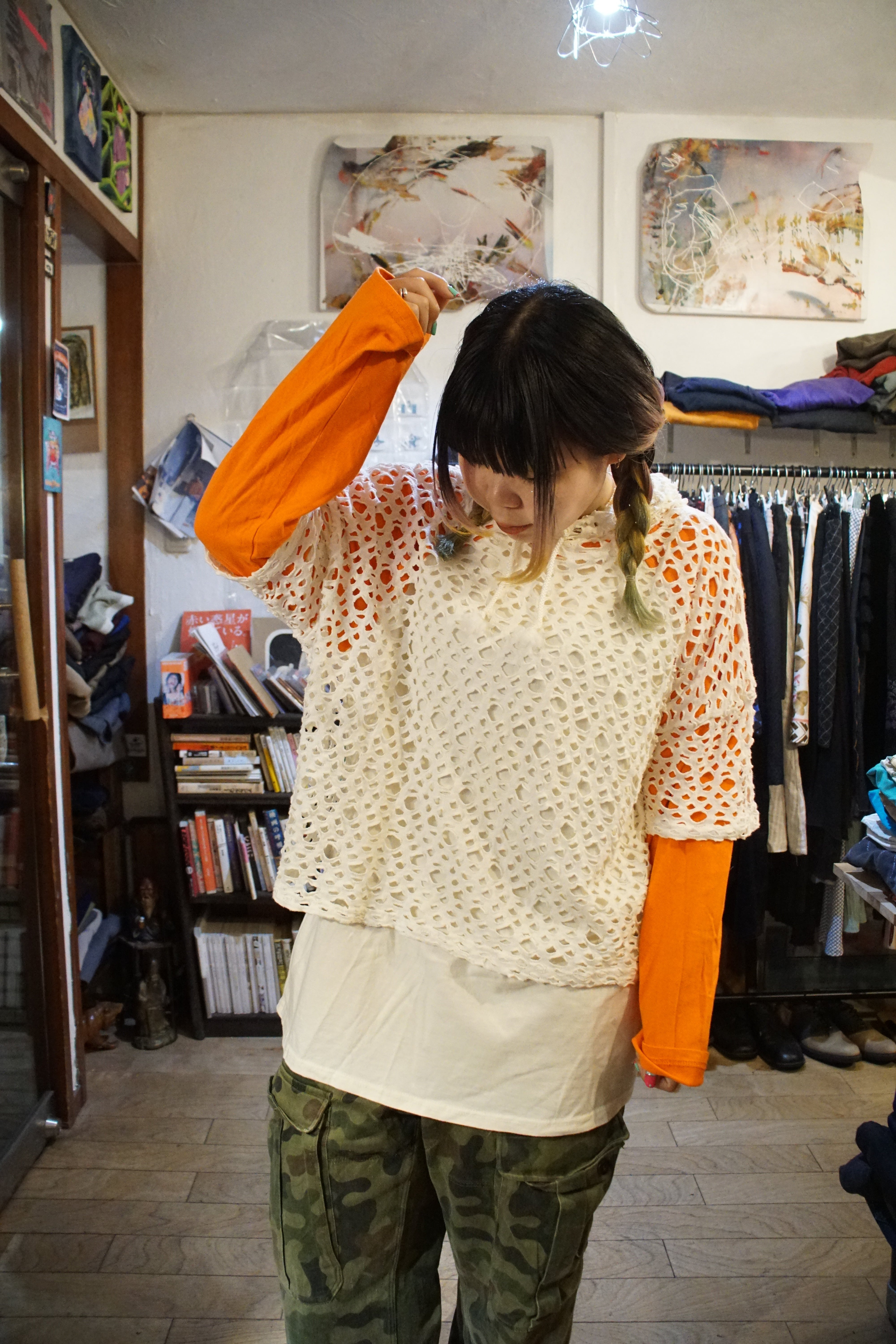 無骨なカモフラージュパンツやストリートの空気感に対する、決定的な「抜き」の加減としても機能しています。