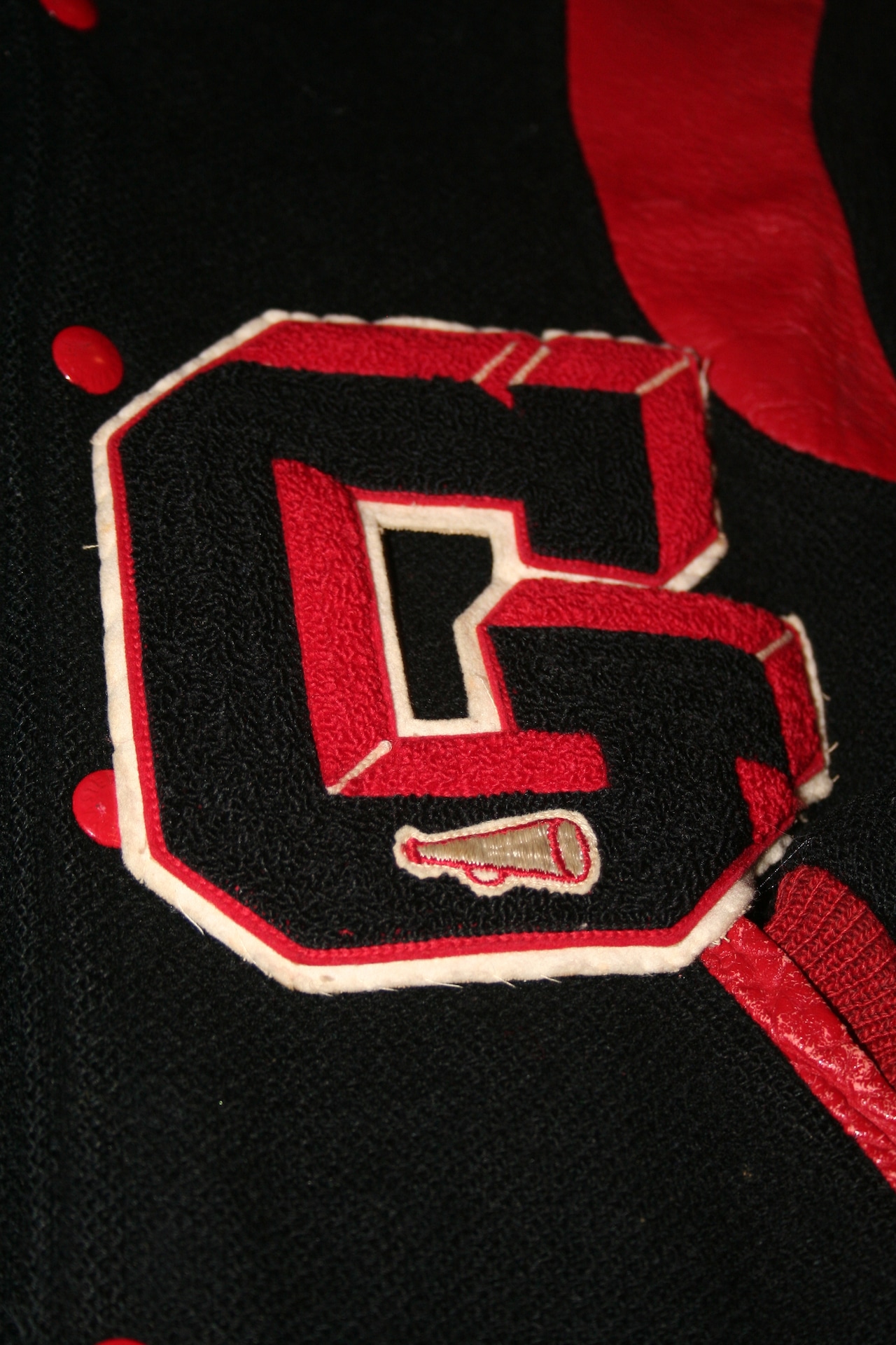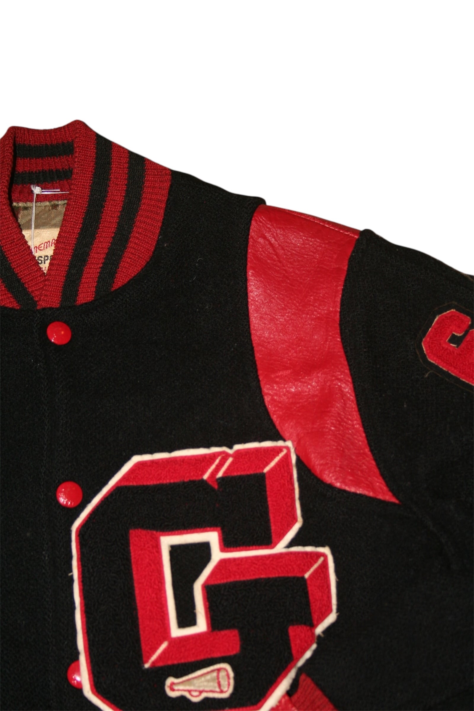 肩の内側をえぐるレザー切り替えに、後付けされたデカめワッペン。