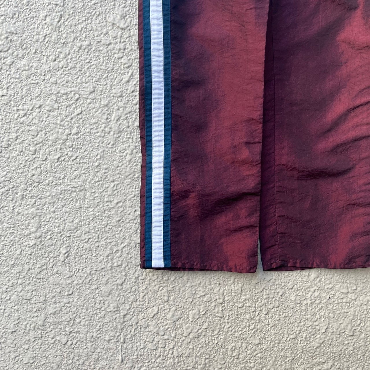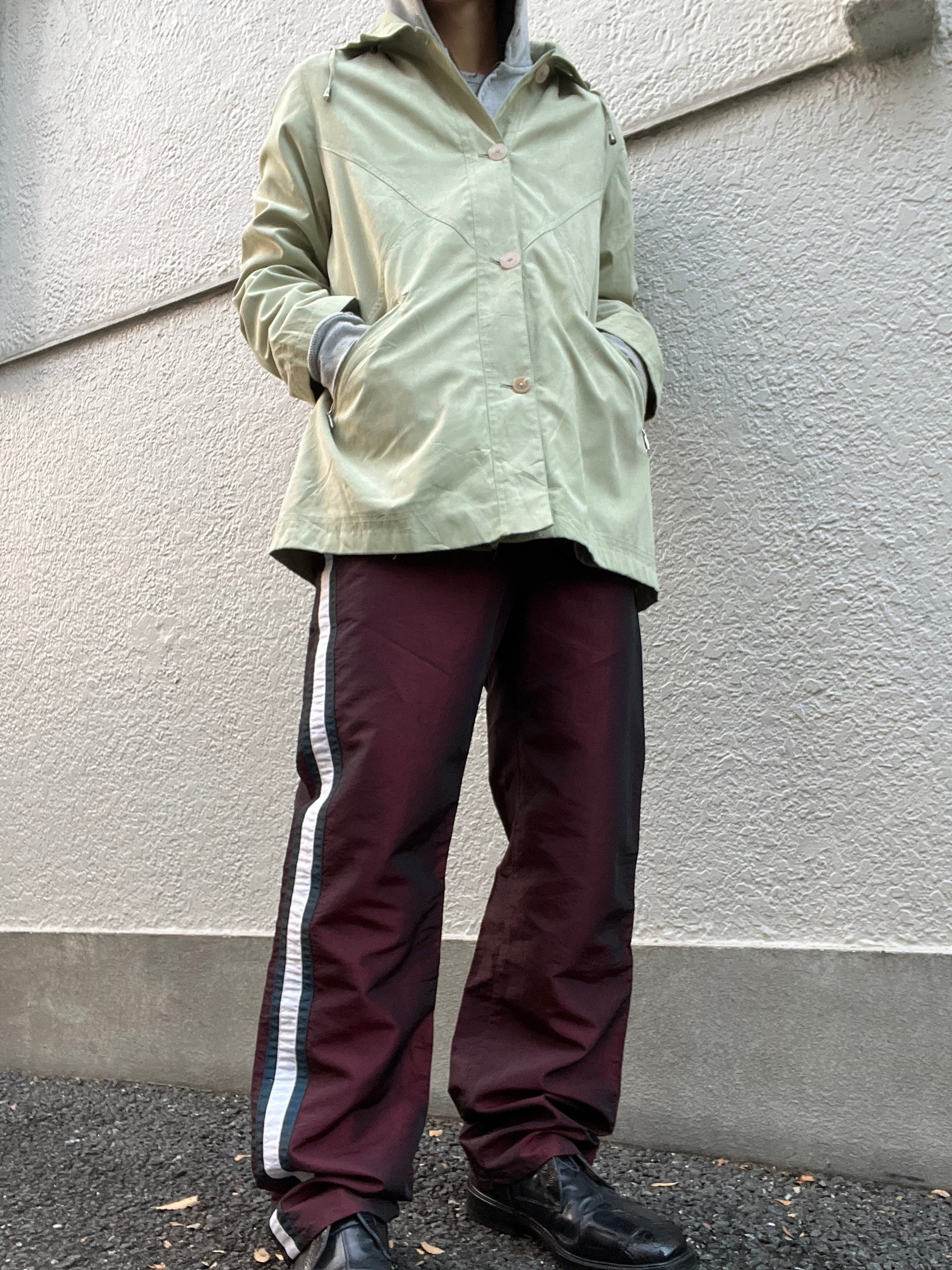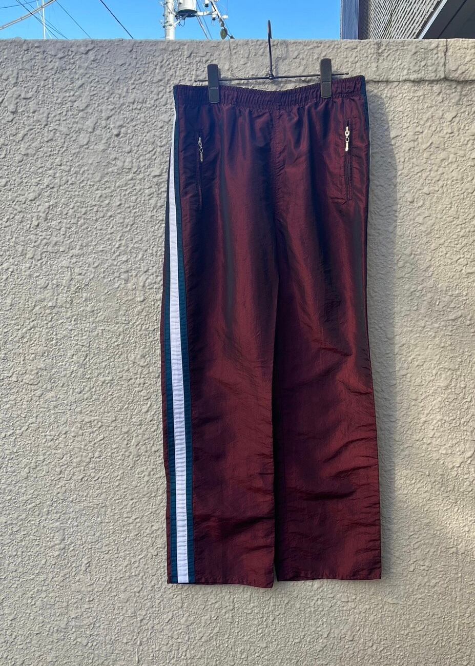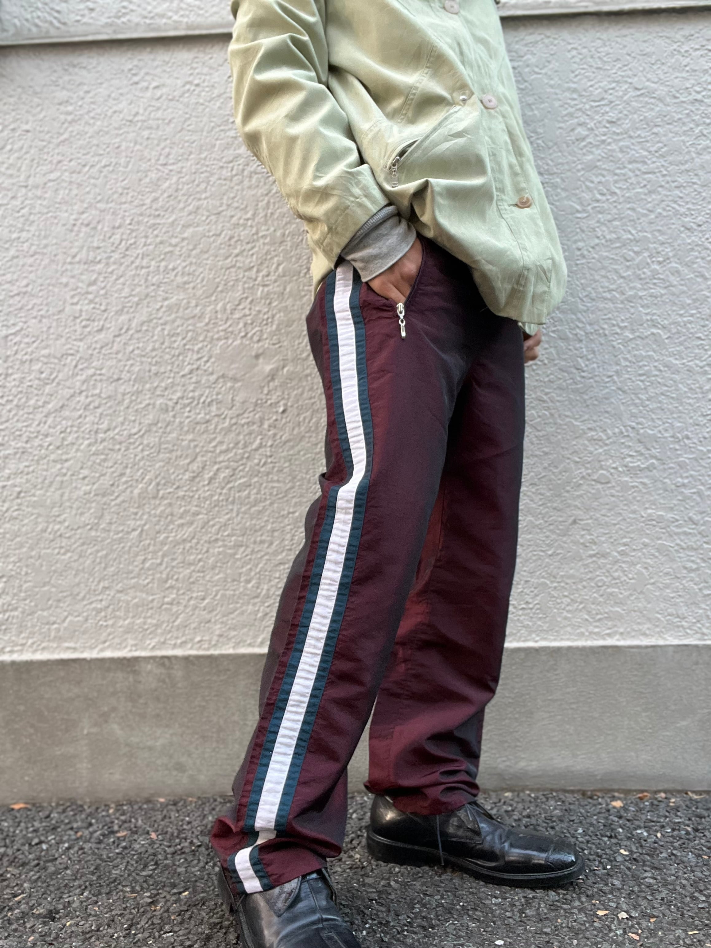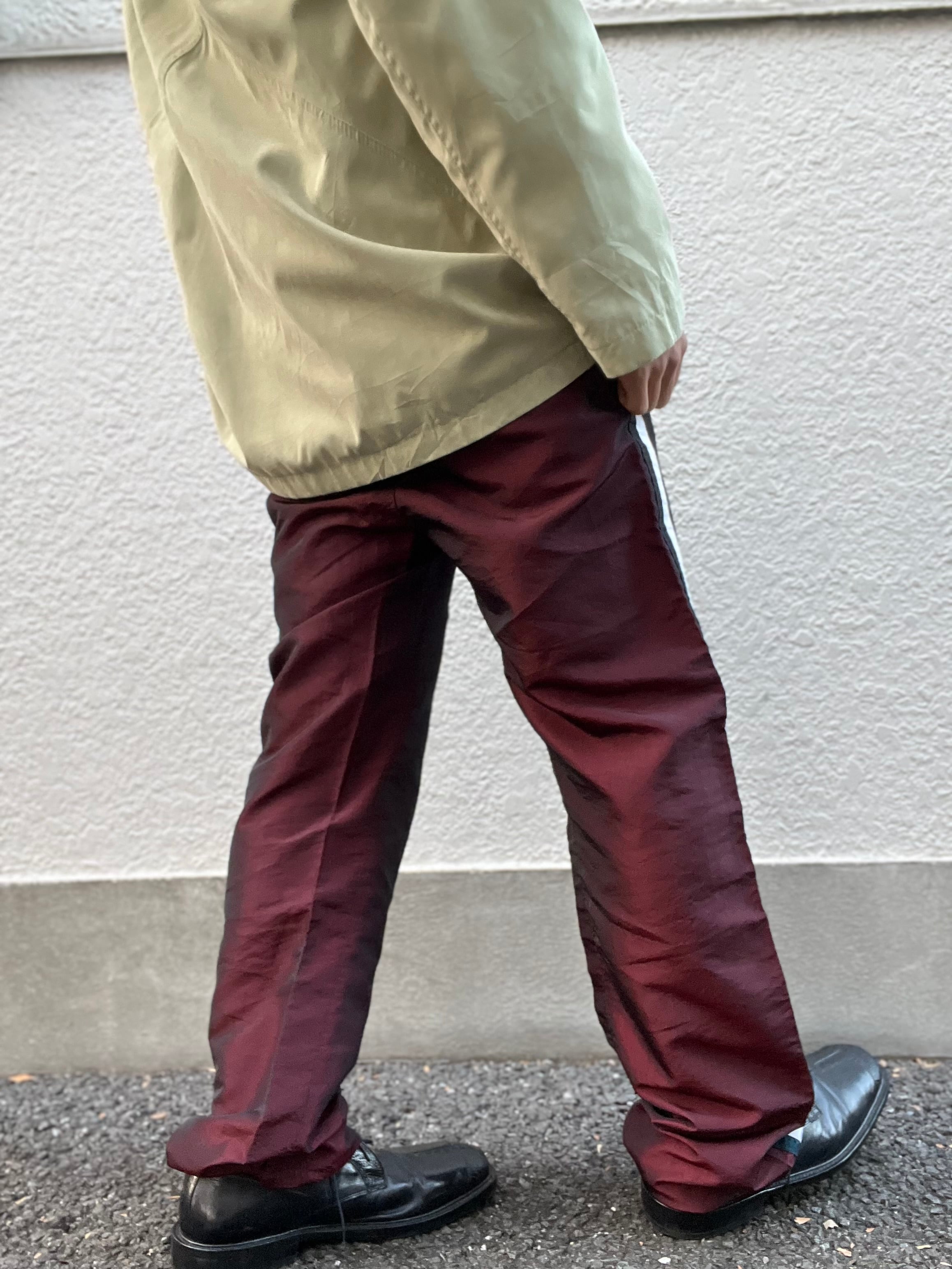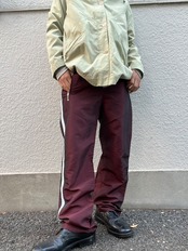 こちらは光沢感もさながら、ストレートに落ちる絶妙なシルエット。プレーンな靴と合わせるとフレアパンツのような広がりも見せる、サイドラインもコーデのアクセントに。
