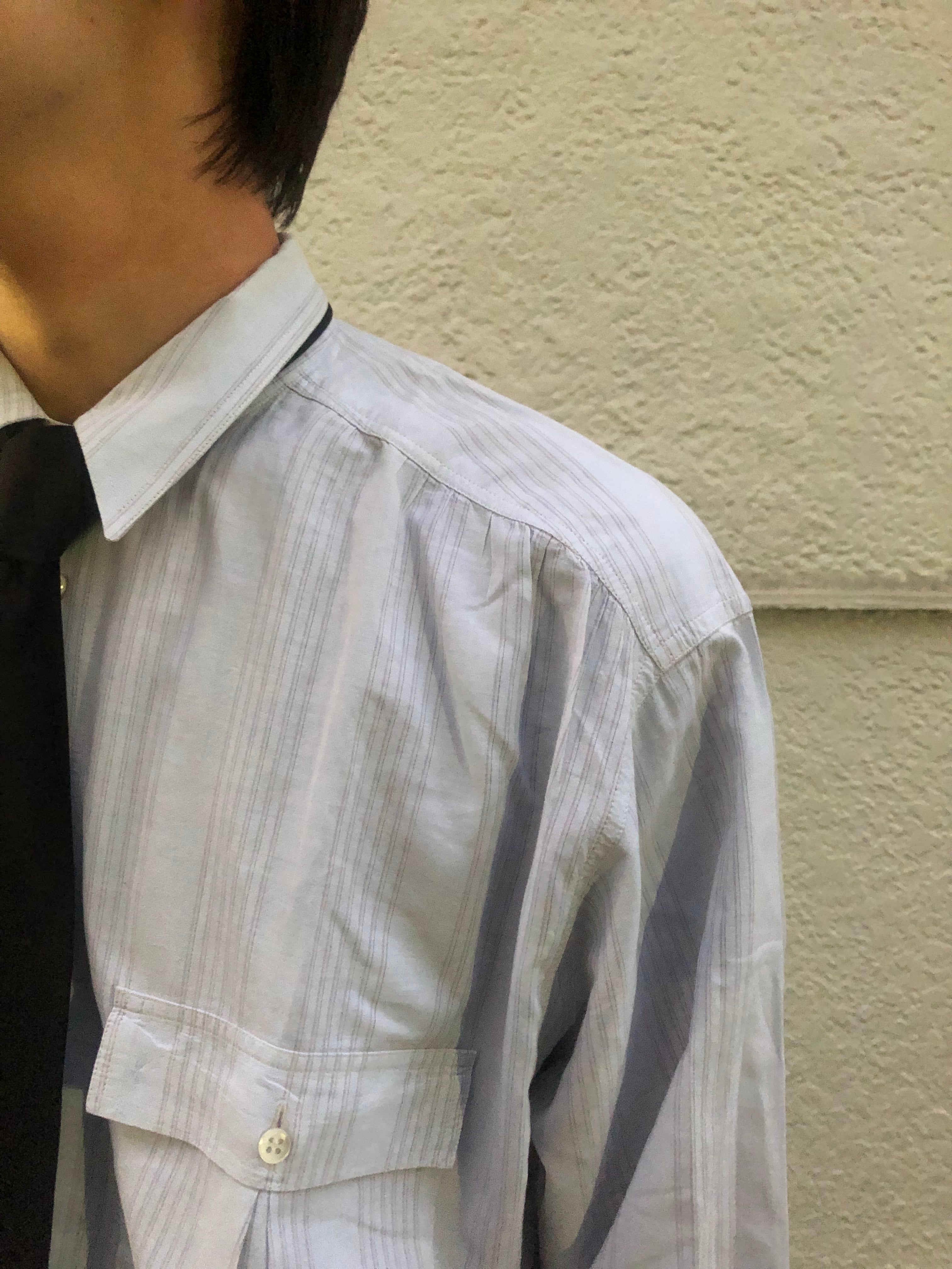 高級なシャツに見られる細かな縫製ピッチですが、小さめの襟が全体のシルエットを引き締め、フォーマル過ぎずカジュアルに着れます。