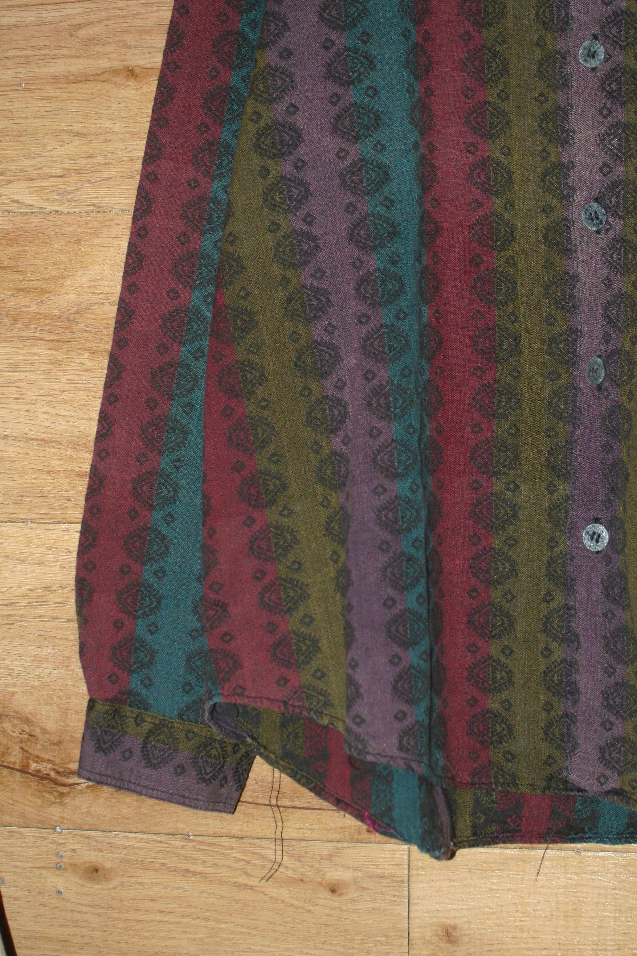 カラーリングにエスニック要素が強いので、クラシックなアイテムのインナーに刺せば中性的なコーデに。