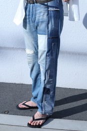 ウエスト位置からサイドに襤褸デニムを切り替えたデザイン。
