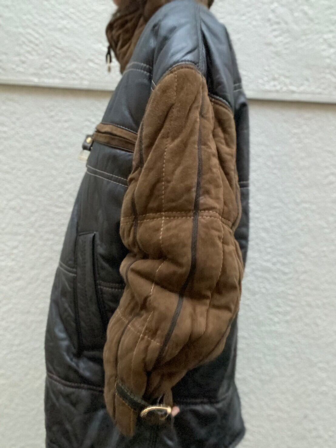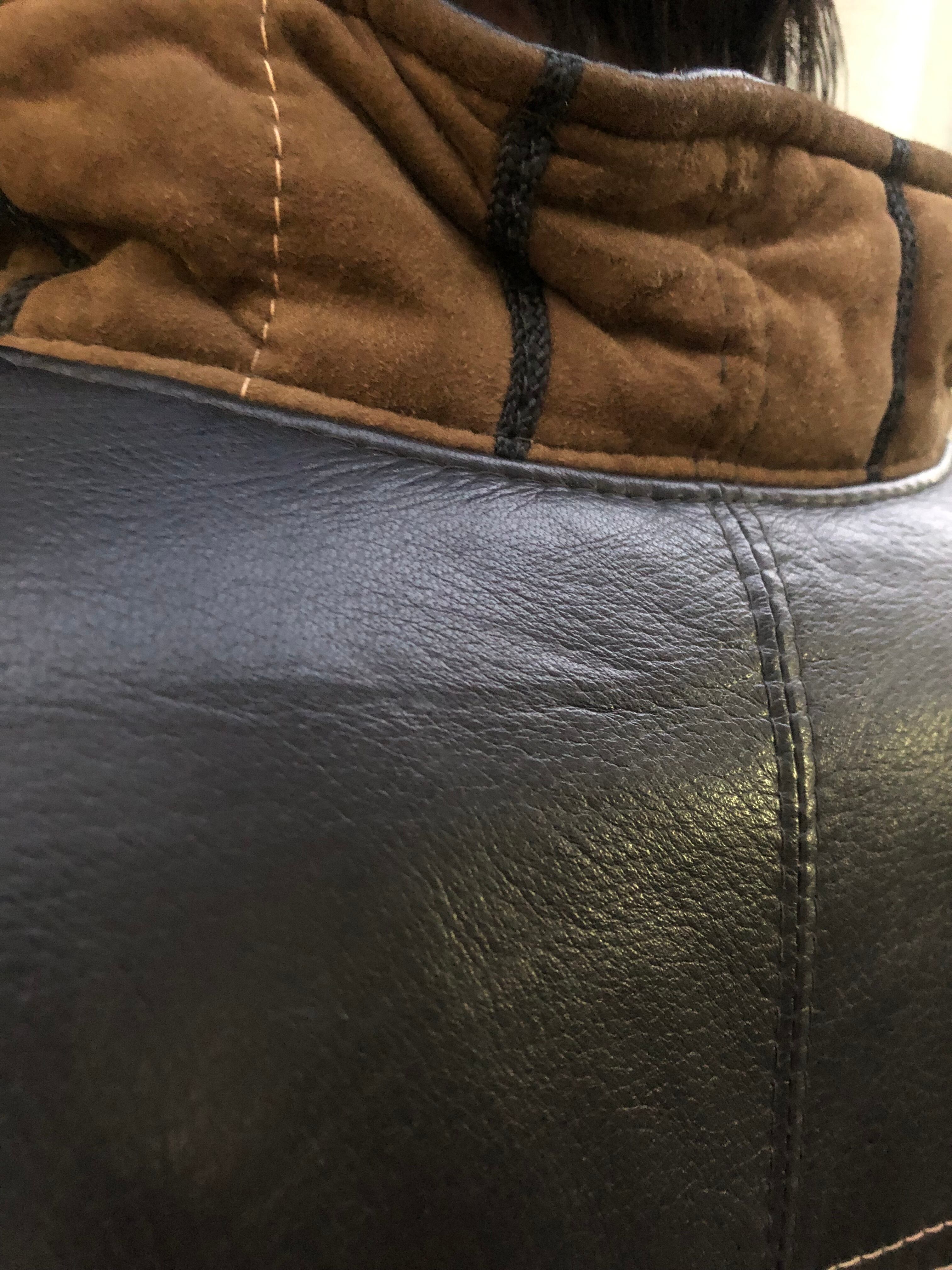 風を通さないで有名なレザー生地、アームのスウェードはボリュームを減らす抜け感も担っています。