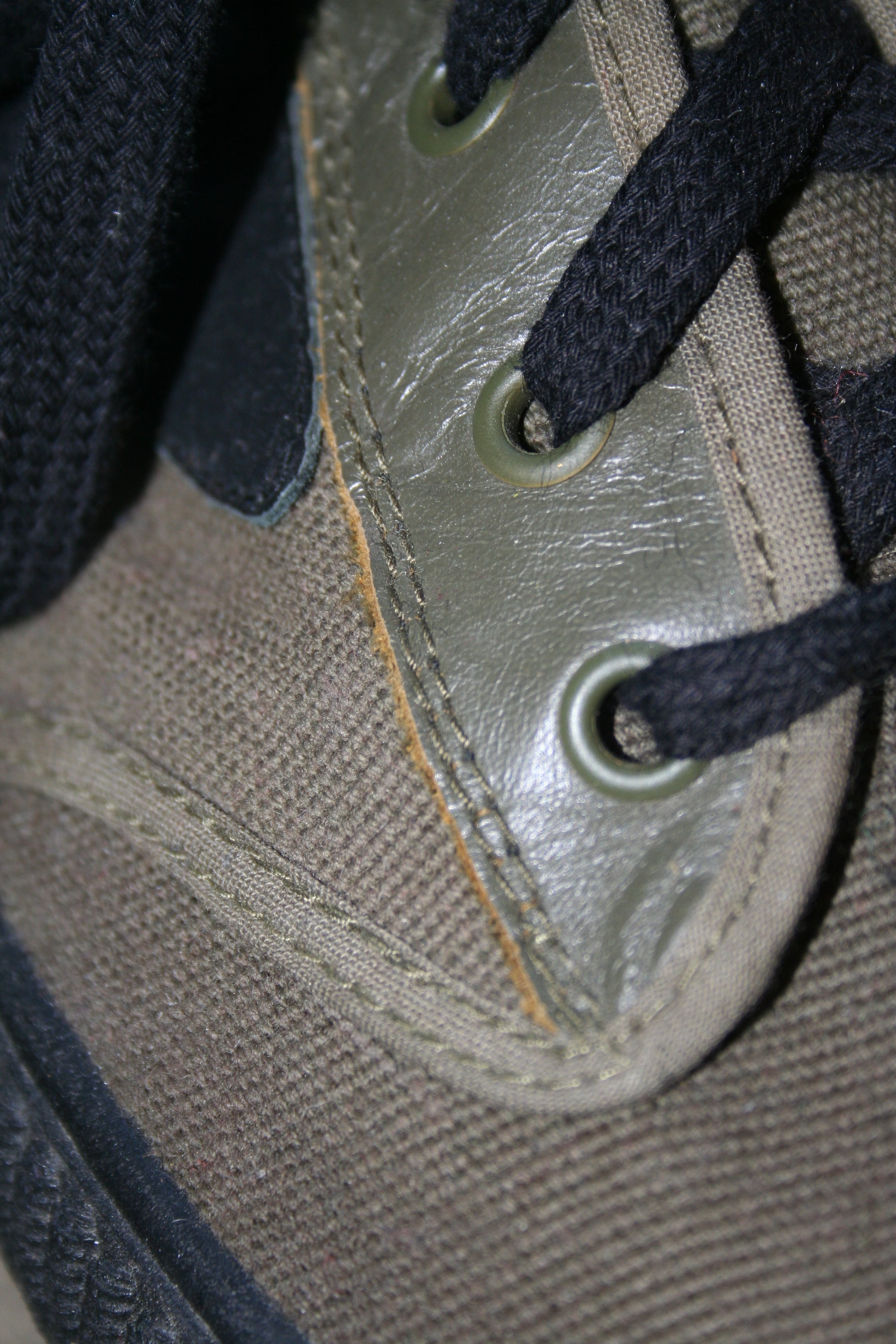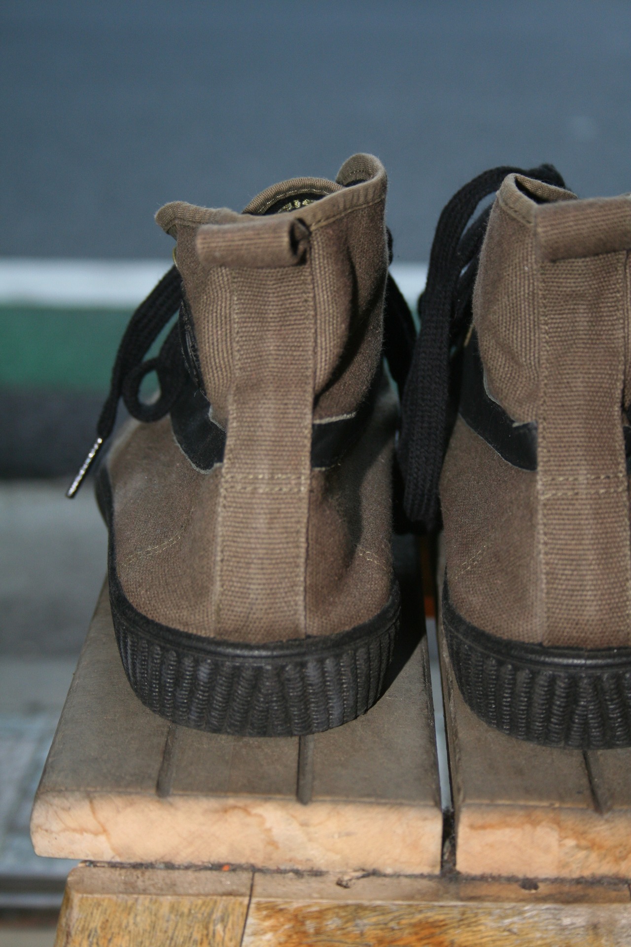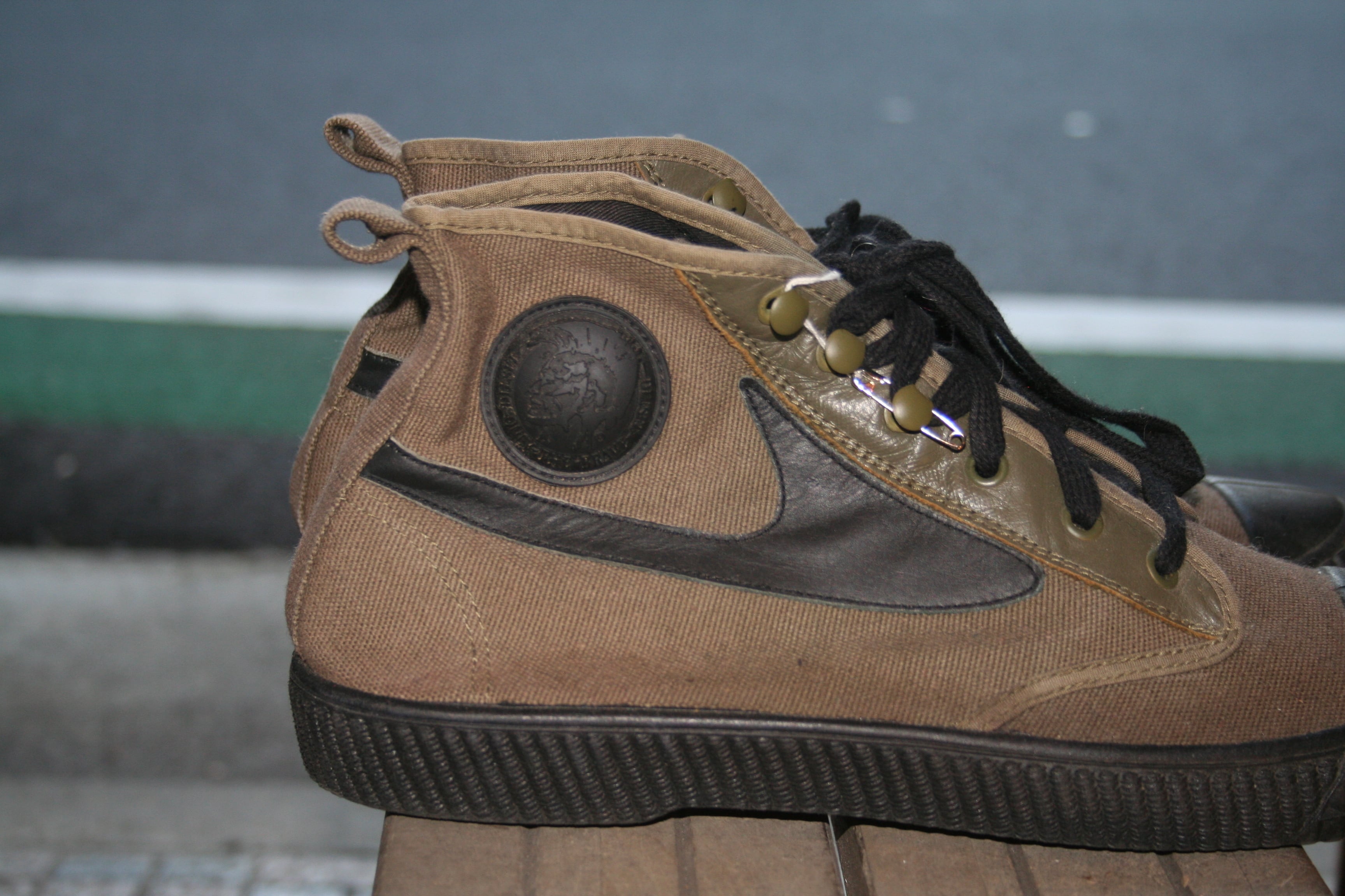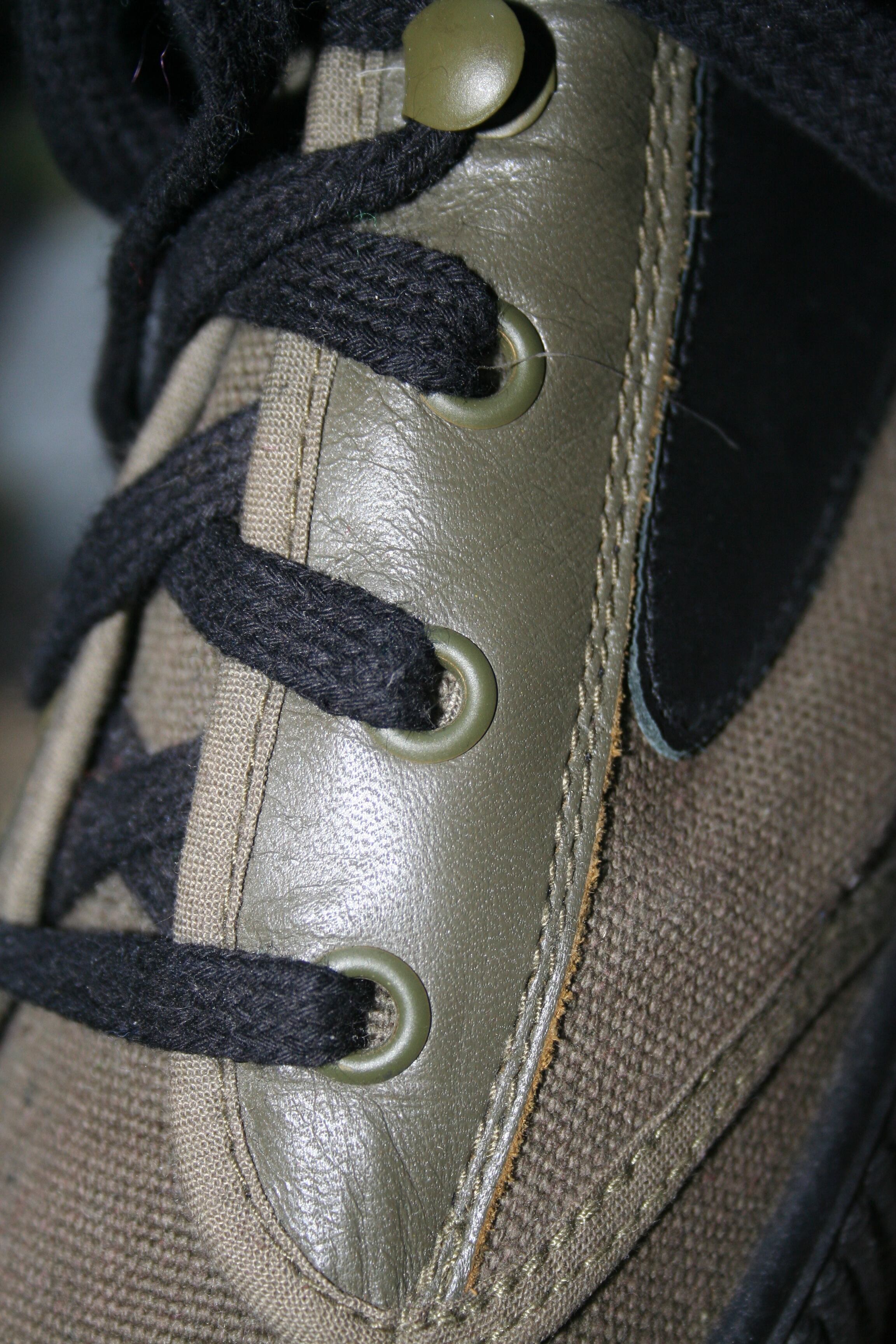 NIKEを連想させるスラッシュデザイン、スタッズ、ゴムソールなどトレイルシューズのようなディテールを組み合わせた一足。